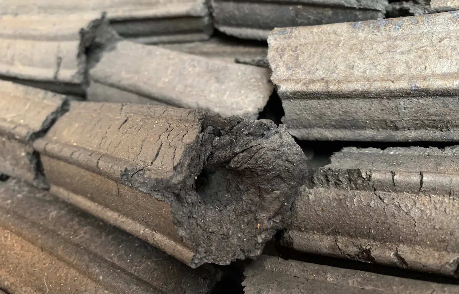 A charcoal log starts with carbonised hardwood. The wood is fully converted to charcoal first, then ground and compressed under high pressure with a small amount of natural binder, usually tapioca starch or similar. The result is a dense, uniform log that holds together without chemical additives.